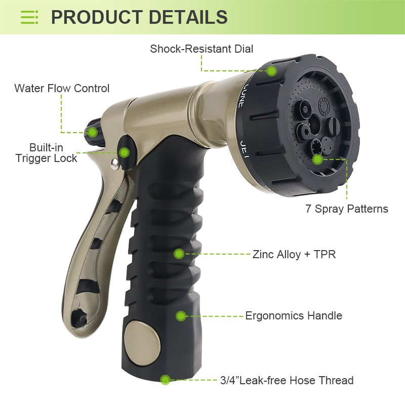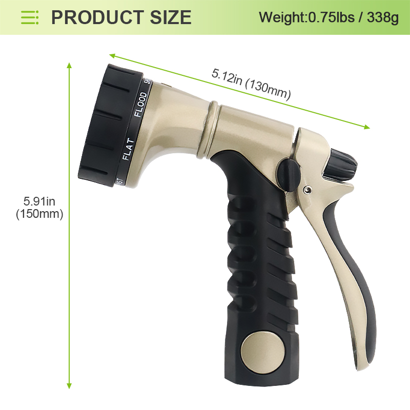 Spray Modes: 8 adjustable patterns (Flat, Flood, Cone, Jet, Center, Mist, Shower, Rinse)
